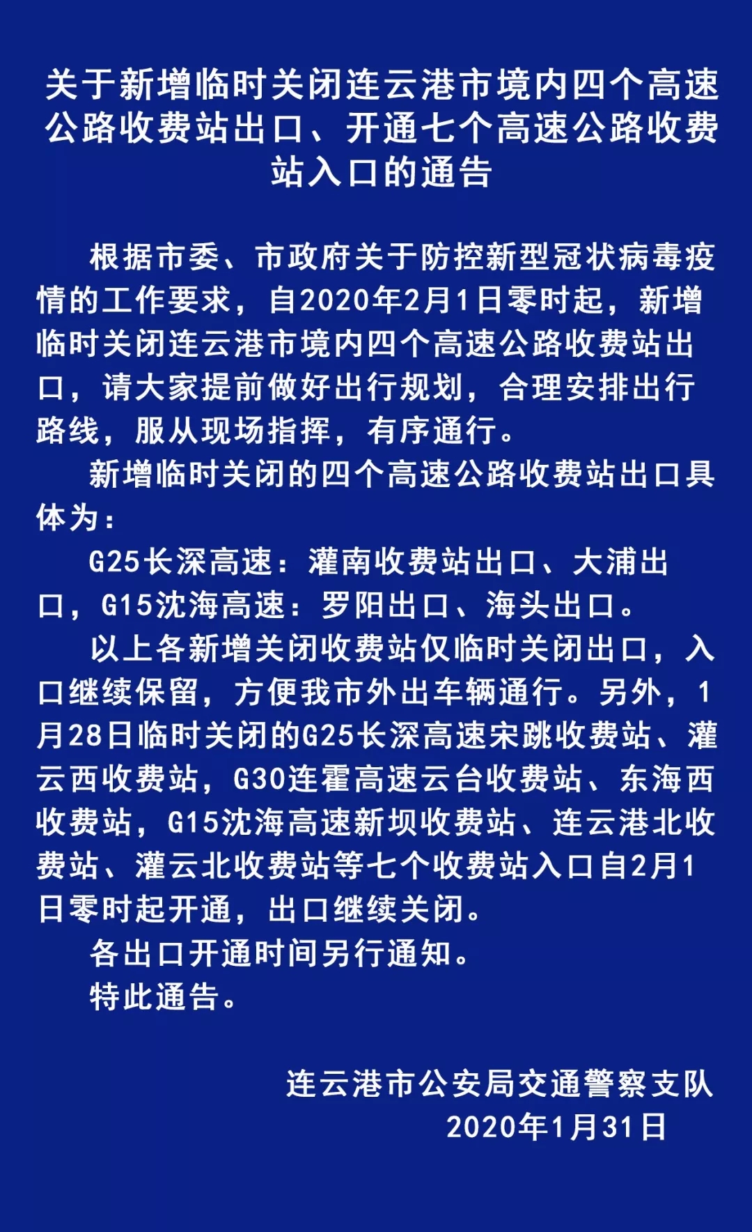 关于新增临时关闭连云港市境内四个高速公路收费站出口、开通七个高速公路收费站入口的通告