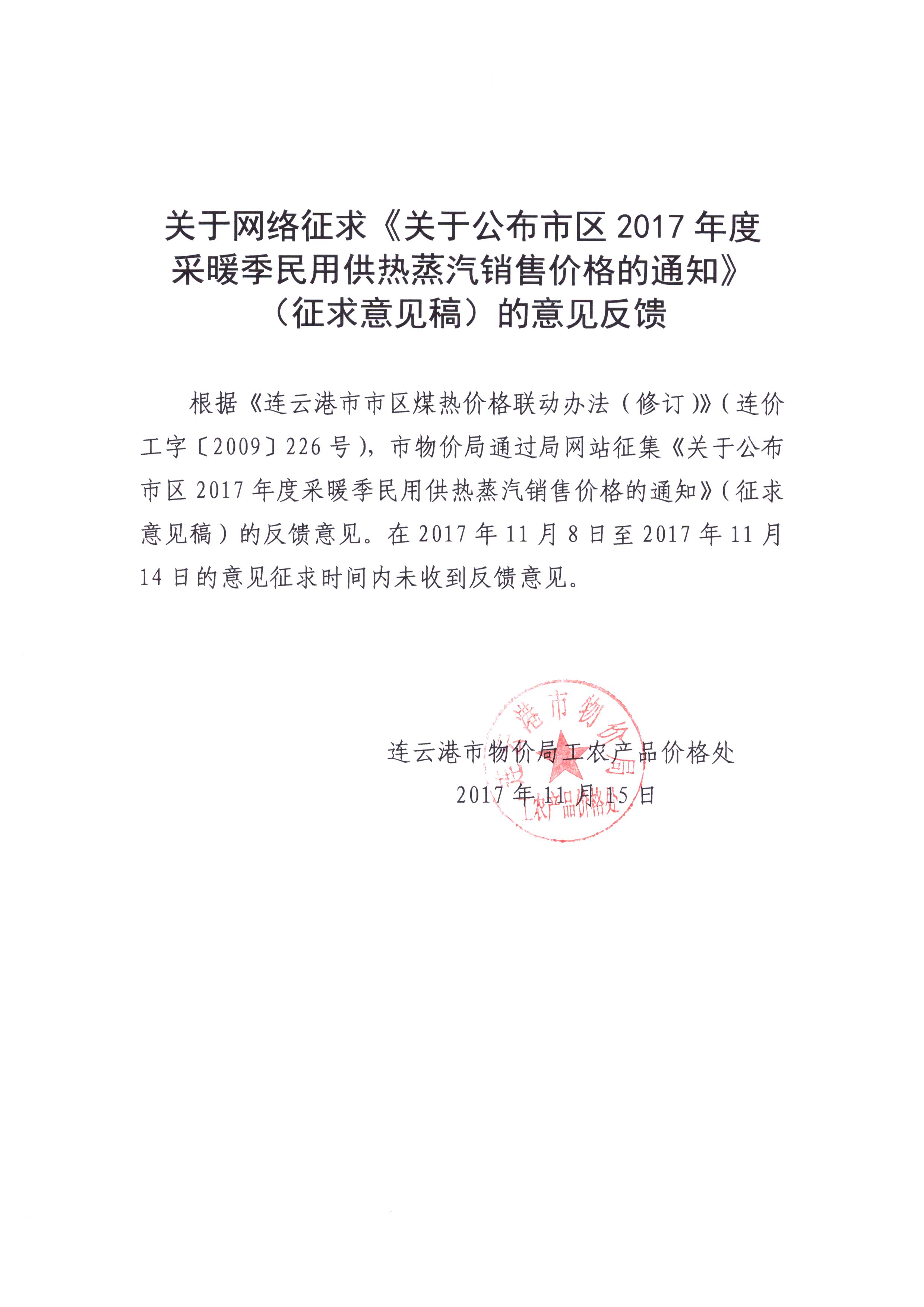 关于网络征求《关于公布市区2017年度采暖季民用供热蒸汽销售价格的通知》(征求意见稿)的意见反馈