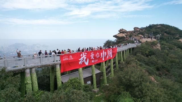 10月1日上午,市民游客来到海上云台山景区,在云顶手持红旗合唱,向伟大祖国表白。