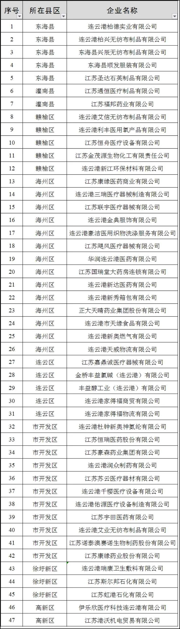 47家首批疫情防控重点保障企业中,东海县占5家,灌南县2家,赣榆区5家,海州区14家,连云区5家,市开发区11家,徐圩新区3家,高新区2家,共涉及卫生防疫、医药生产、医用器材生产、重要生活物资保障等多个领域。