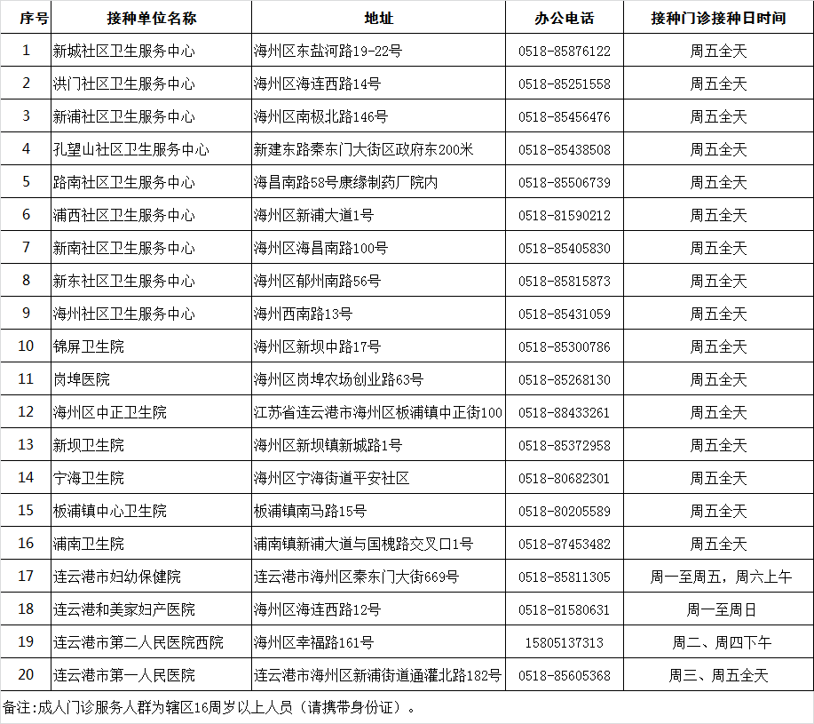 海州区成人预防接种单位名单