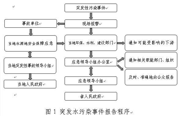 根据监测结果,若受污染水体水质恢复到正常范围,且污染物在水体和底泥中的残留量不会引起二次污染时,可以由应急领导小组宣布终止应急预案,恢复正常取水、供水。发生突发性污染事故时的报告和处置流程见图1、图2。