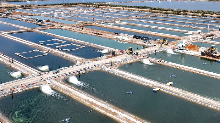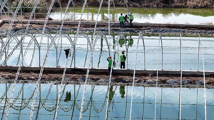昨日,在灌云县灌西盐厂水产养殖区,工人进行高品鱼工厂化循环水养殖项目施工。该项目包括工厂化种苗繁育、智能化工厂养殖、大塘棚养基地等,建成后将形成集鲥鱼、加州鲈鱼、桂花鱼等高品鱼种工厂化循环水培育、“渔光互补”集中连片池塘成鱼养殖及水产品流通于一体的现代特种水产养殖数字渔业产业园。